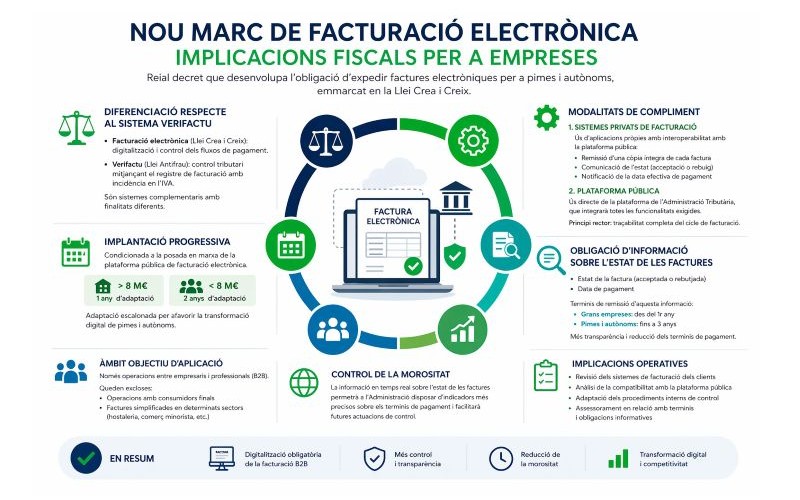 - Facturació electrònica (Llei Crea i Creix): orientada a la digitalització i al control dels fluxos de pagament